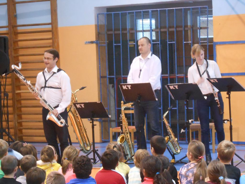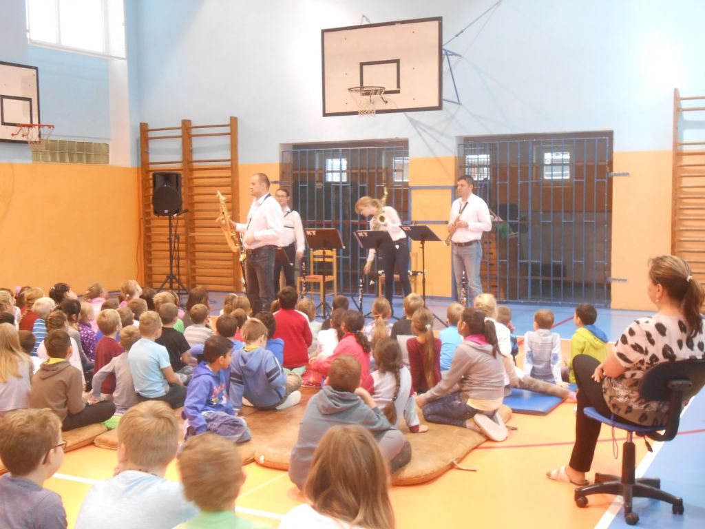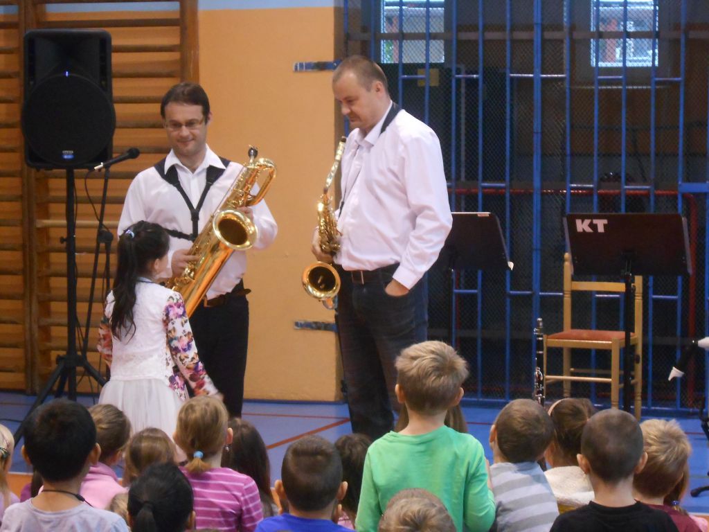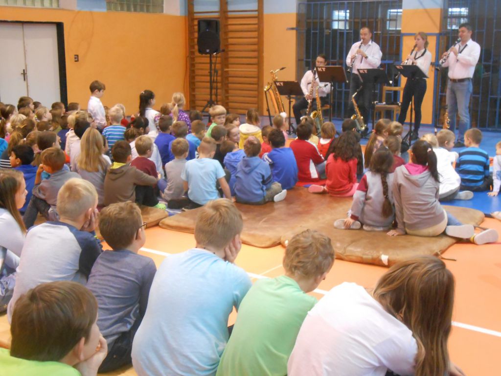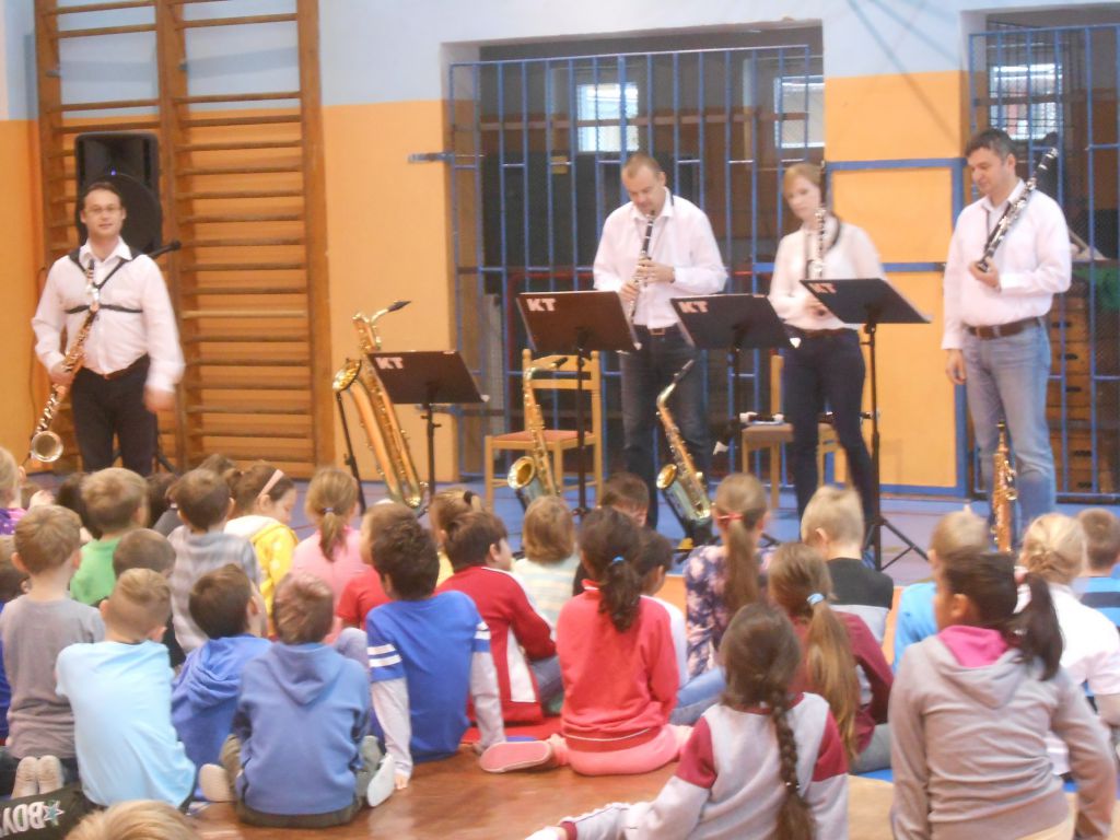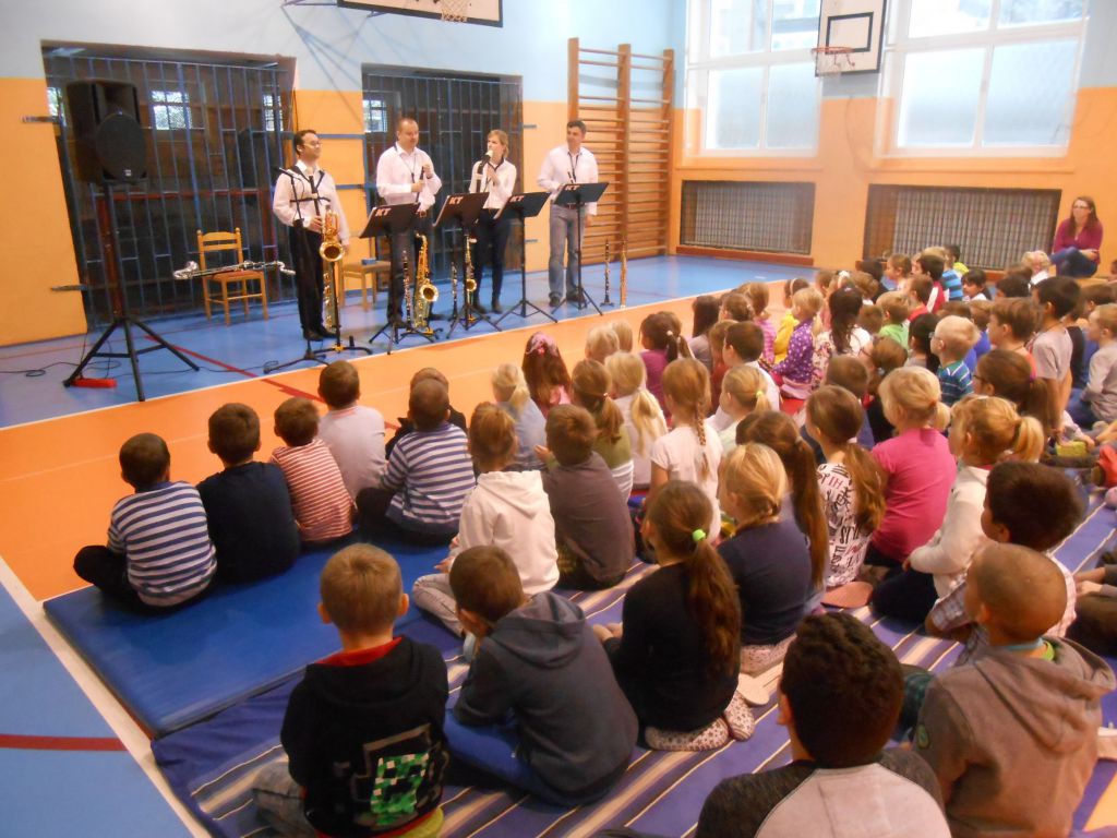 Ve čtvrtek 10. listopadu 2016 měli žáci naší školy možnost nahlédnout do práce profesionálních hudebníků. Členové souboru Harmony Quartet populární formou seznámili posluchače s rodinou dechových nástrojů, konkrétně se zobcovými flétnami, saxofony, klarinetem a basklarinetem. Celý program byl založený především na aktivním poslechu populární hudby / jazzové, muzikálové, rockové, swingové / a na vlastním zapojení dětí do akce. Pořad dostal od žáků i učitelů vynikající hodnocení.