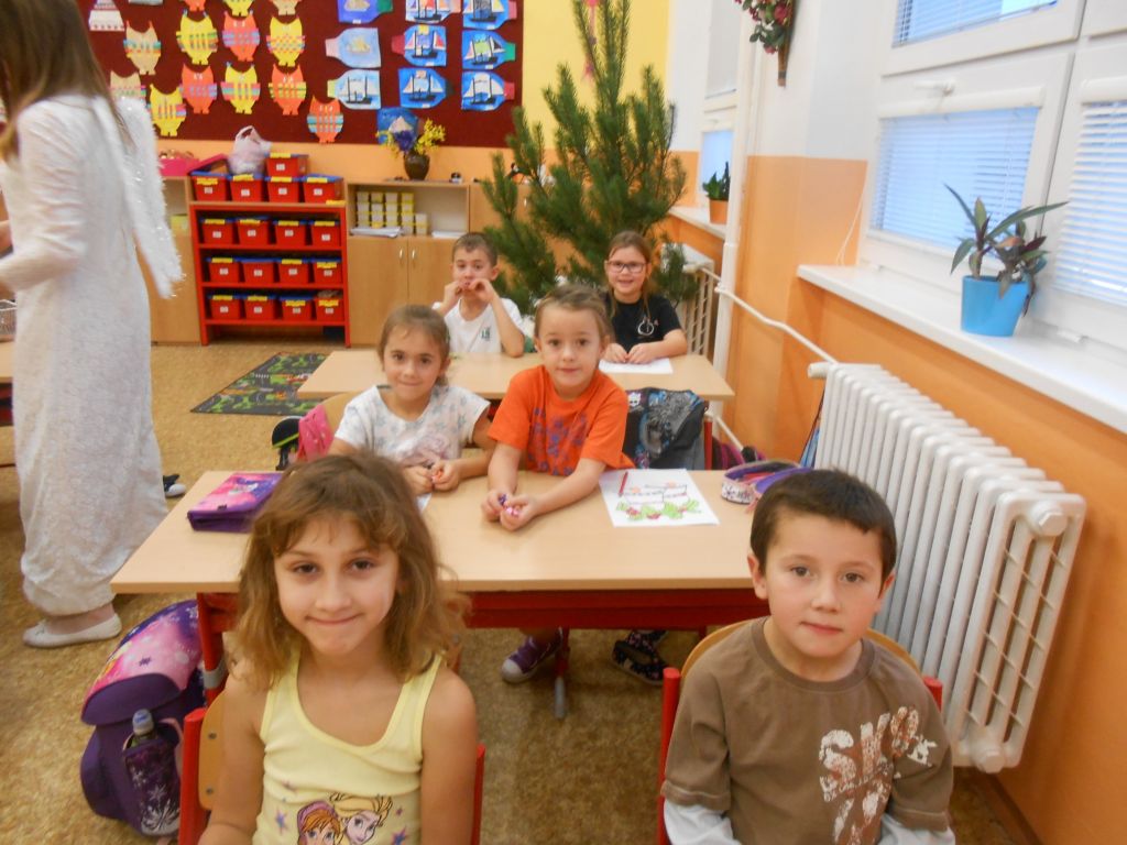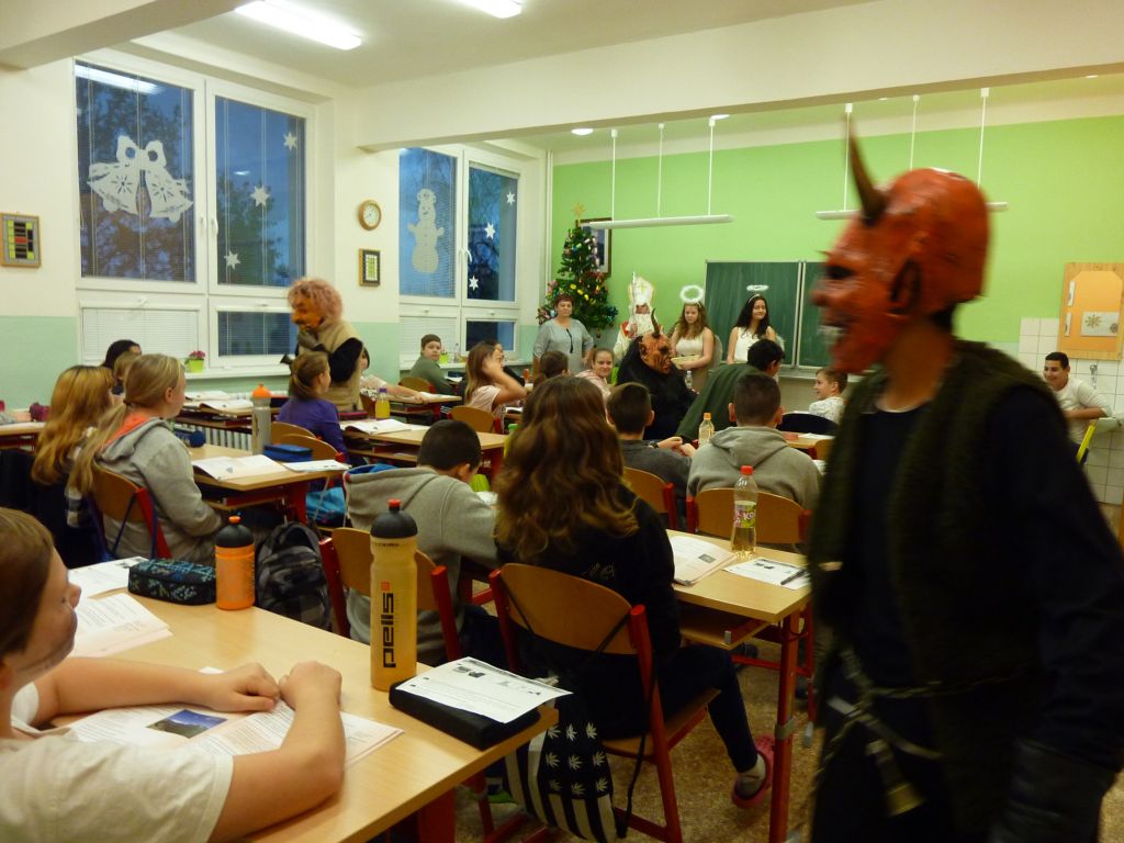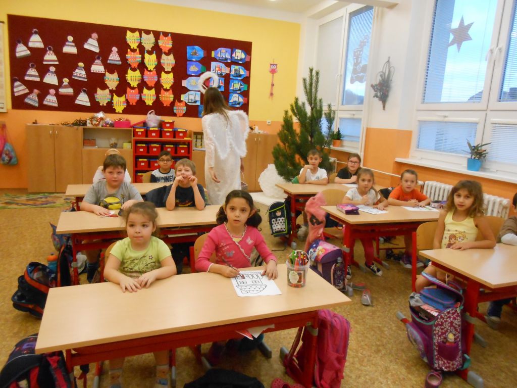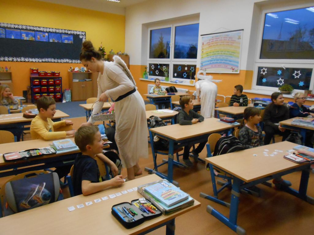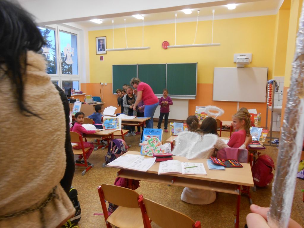 V každé třídě musely děti zazpívat, zarecitovat, vyprávět krátký příběh. Po té je andělé odměnili . Členové obou skupin se na každoroční akci předem připravili – tvorba masek, převleků. Děkujeme.