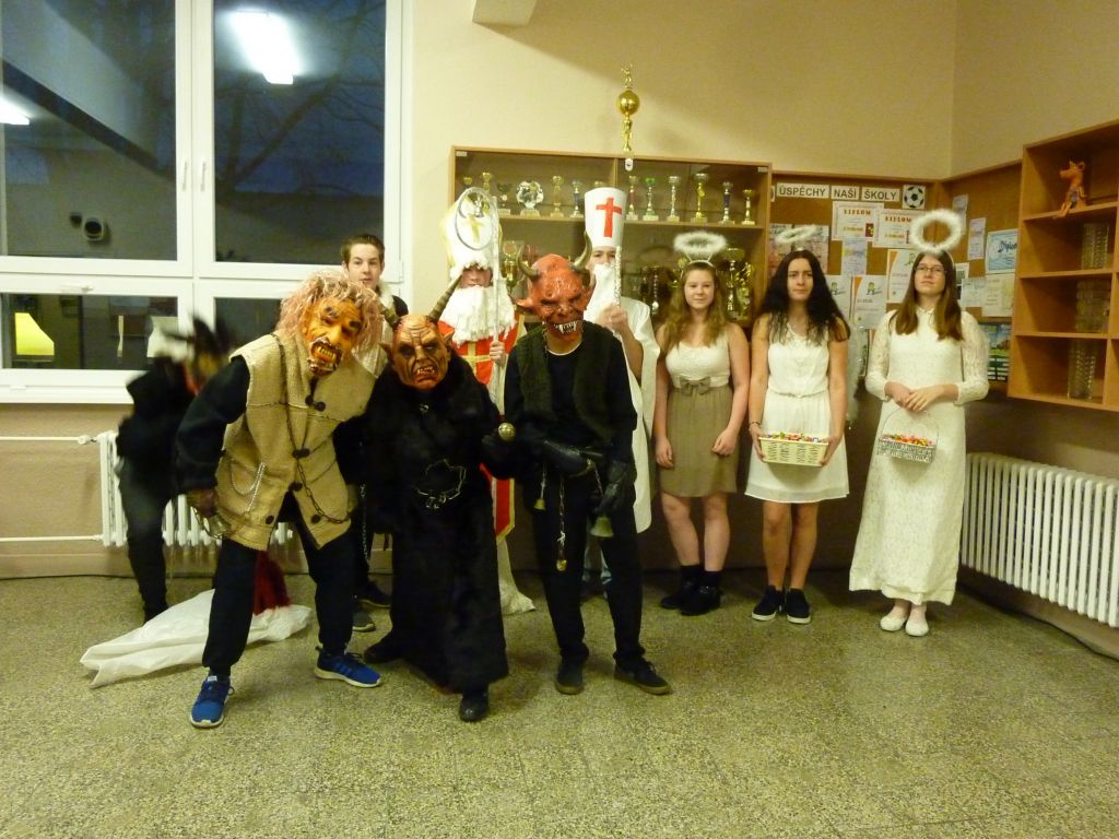 Ve středu 6. prosince připravili žáci 9. ročníku pro své mladší kamarády a spolužáky „Mikulášskou nadílku“. Rozdělili se na dvě skupiny, v každé byl Mikuláš, andělé a čerti. Jedna skupina procházela tzv. domečkem / tj. stará budova 1. stupeň/, druhá skupina měla na starost žáky od 4. do 8. třídy na druhé budově.