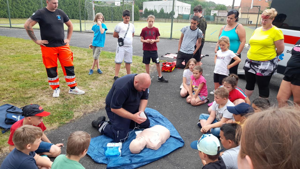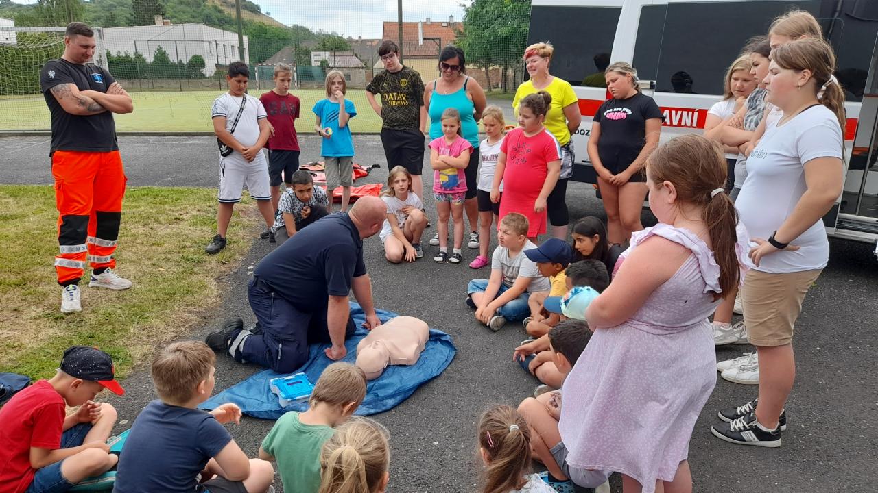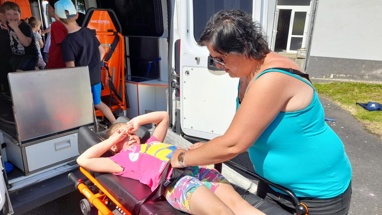 Záchranáři seznámili děti s druhy sanitek a jejich vybavením. Informovali je o různých způsobech 1.pomoci