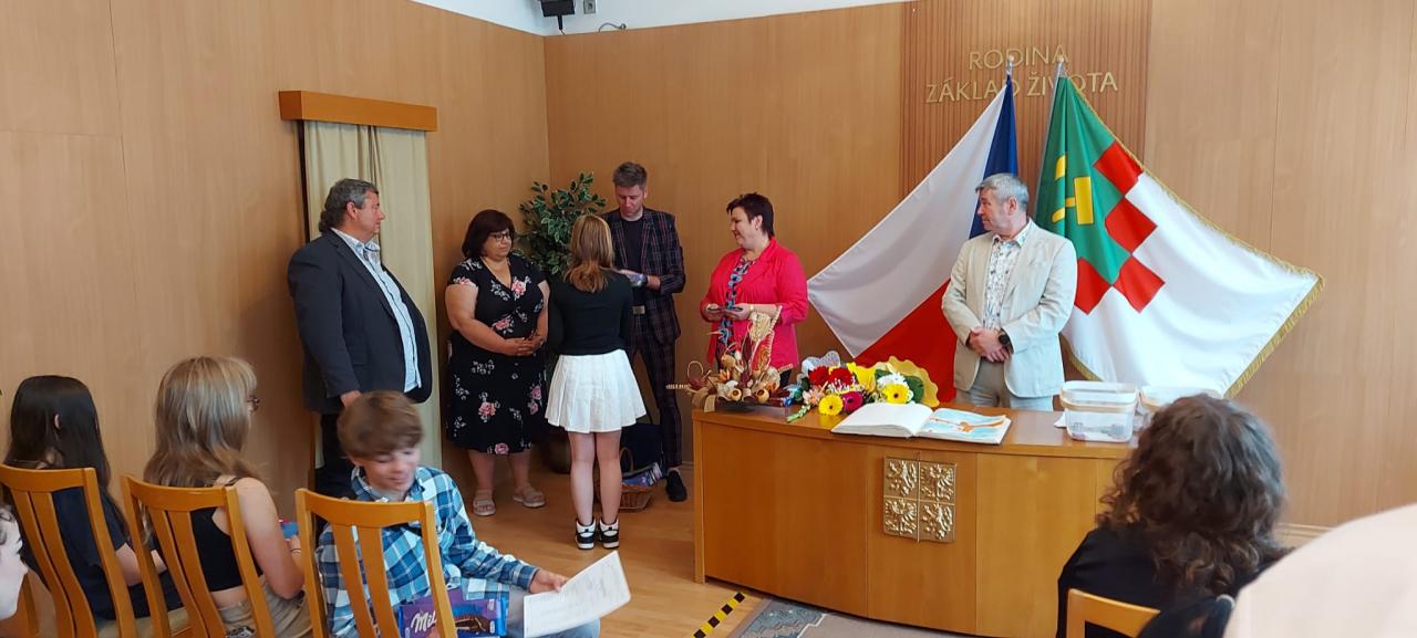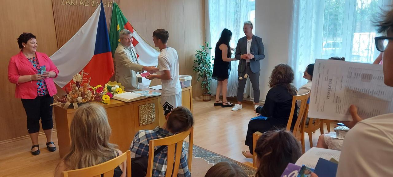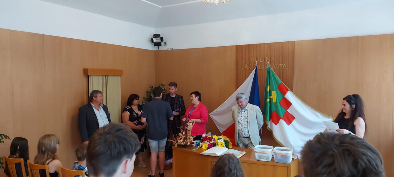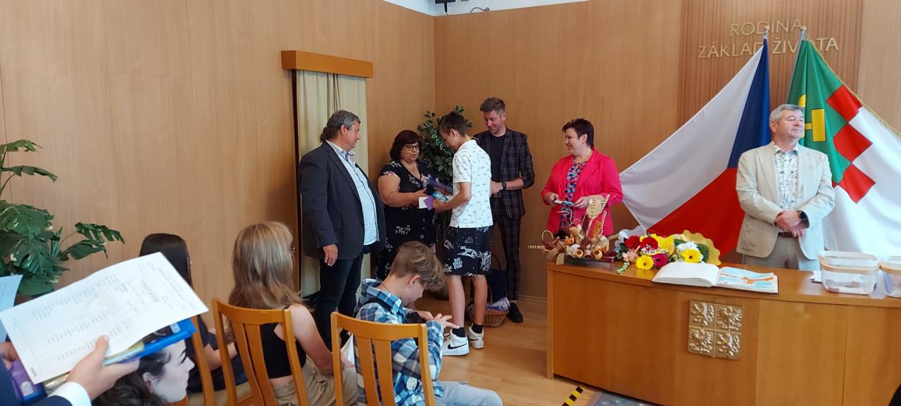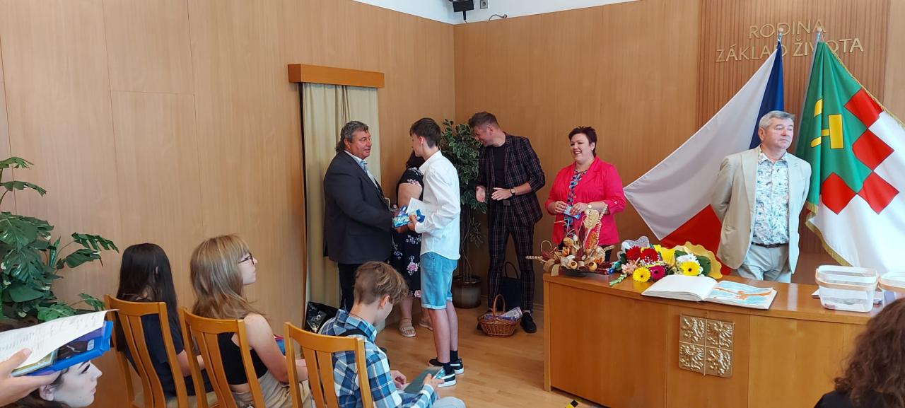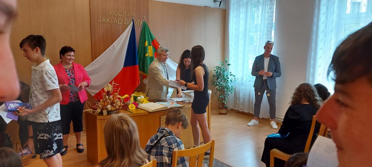 Slavnostní rozdávání vysvědčení žákům 9.ročníku proběhlo na Úřadě městyse Hostomice. Závěrečné vysvědčení a malé dárečky žákům předala paní třídní učitelka, která jim společně s panem starostou Hostomic, Ledvic, paní starostky a místostarosty Světce a paní starostky Ohníče popřála hodně úspěchů v následujícím studiu.