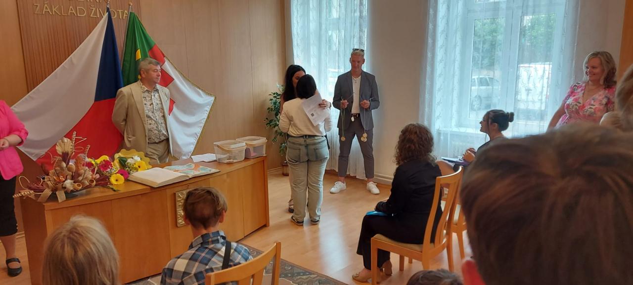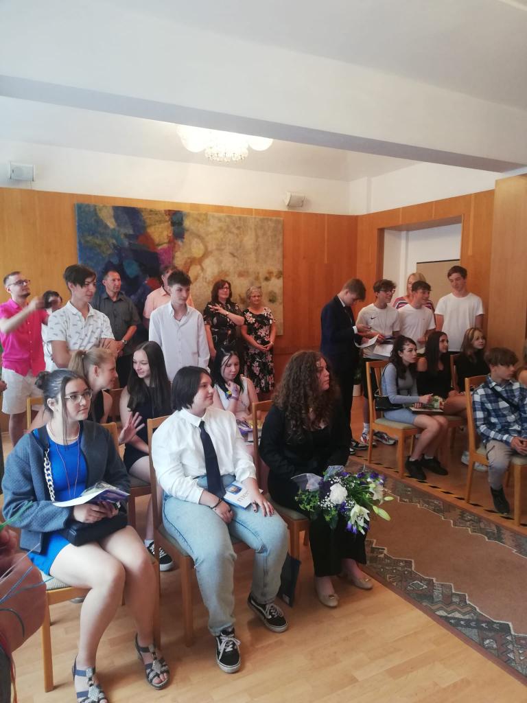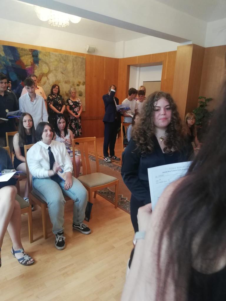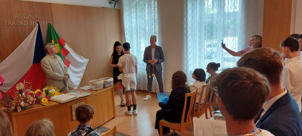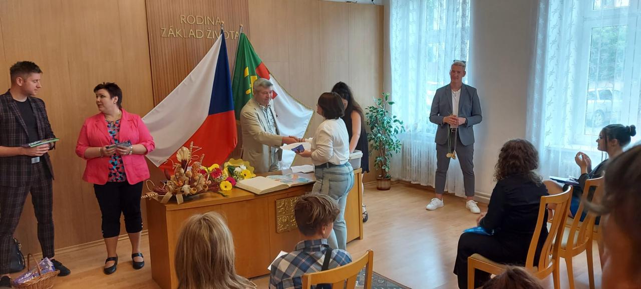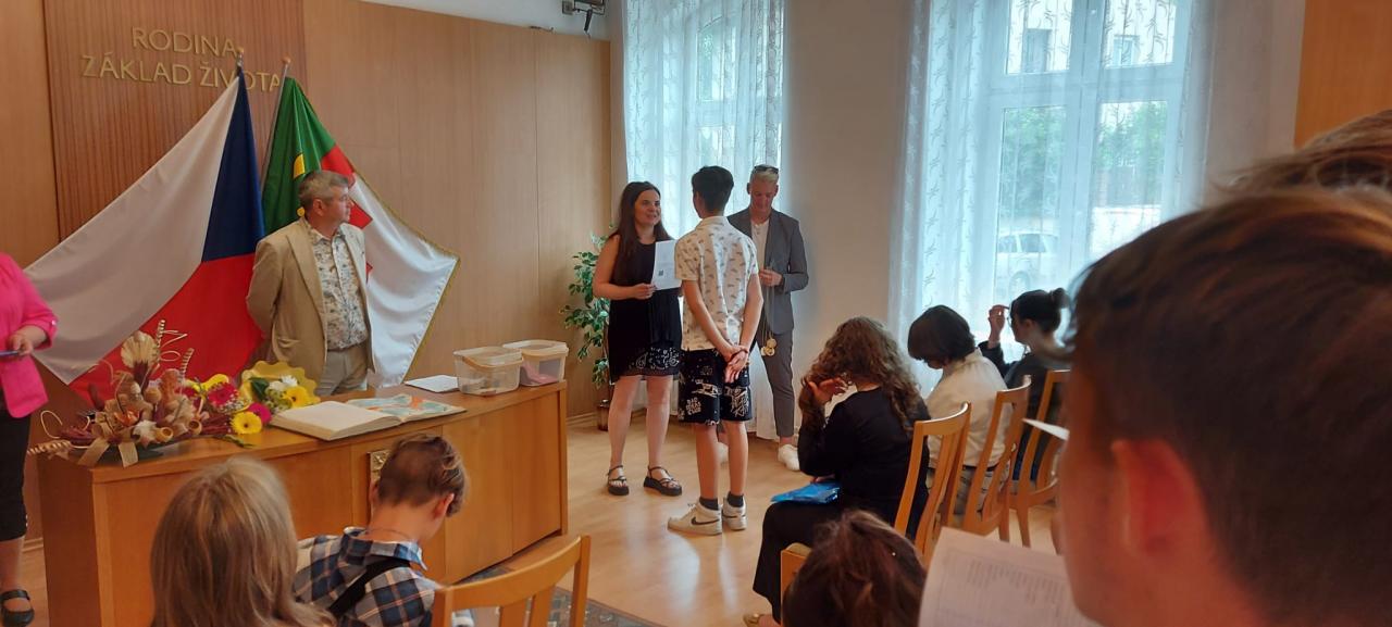 Slavnostní rozdávání vysvědčení žákům 9.ročníku proběhlo na Úřadě městyse Hostomice. Závěrečné vysvědčení a malé dárečky žákům předala paní třídní učitelka, která jim společně s panem starostou Hostomic, Ledvic, paní starostky a místostarosty Světce a paní starostky Ohníče popřála hodně úspěchů v následujícím studiu.