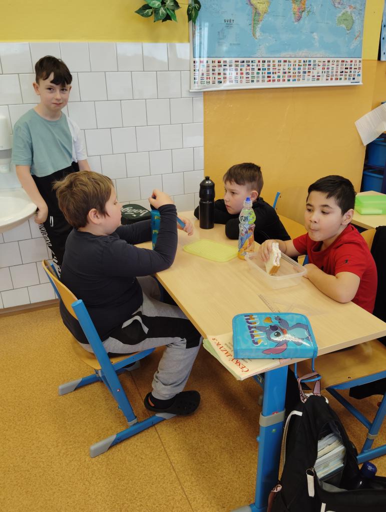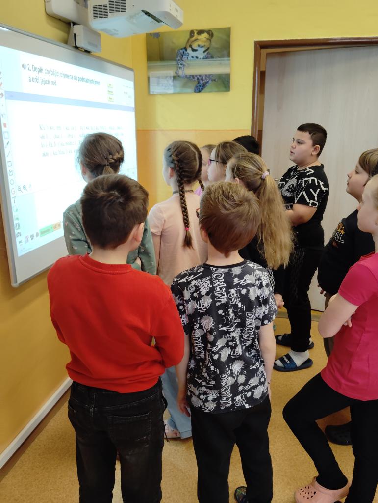 Podívejte se, jak u nás ve 3. ročníku probíhá hodina českého jazyka. Po příchodu do třídy služba rozdává sešity.V hodině společně procvičujeme na interaktivní tabuli vyjmenovaná slova a slova příbuzná po p. Potom každý sám zvládne doplňovačky i/y v pracovním sešitě. A po hodině - hurá svačina.