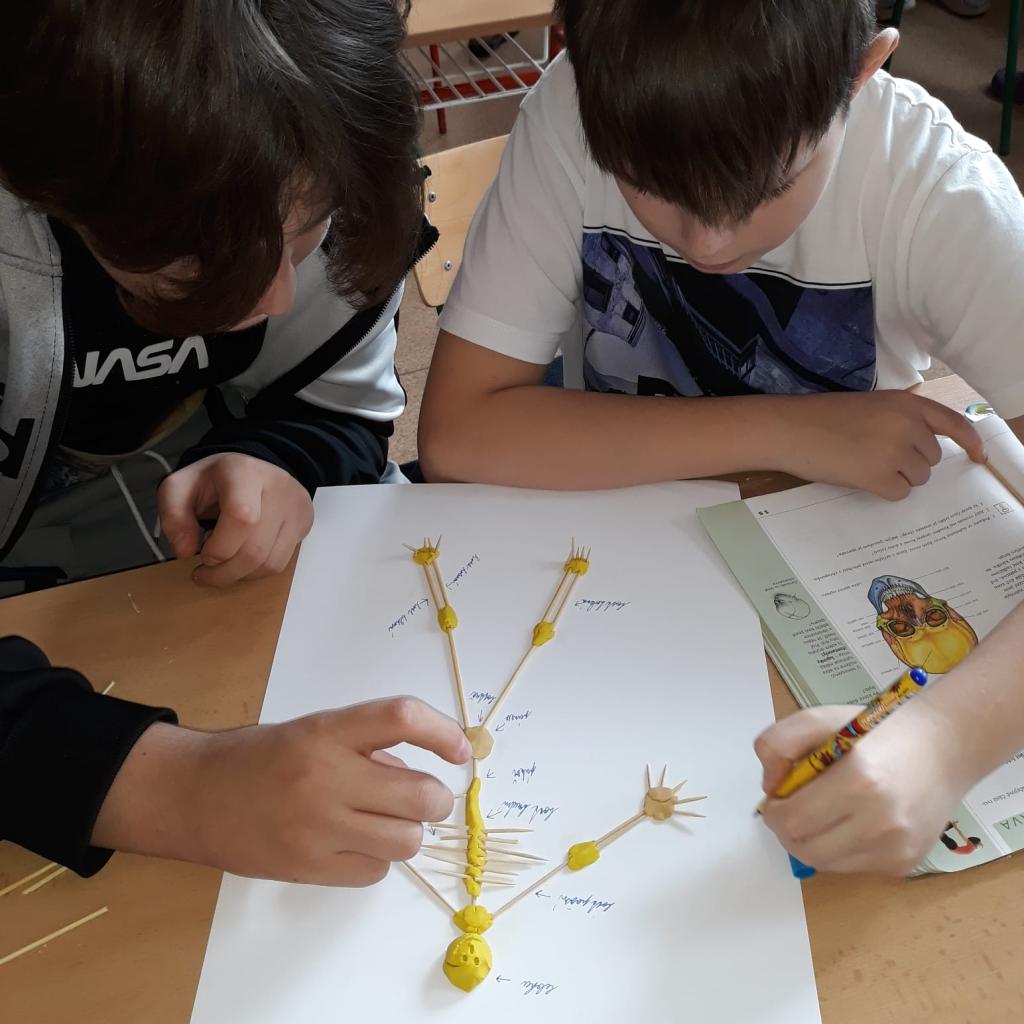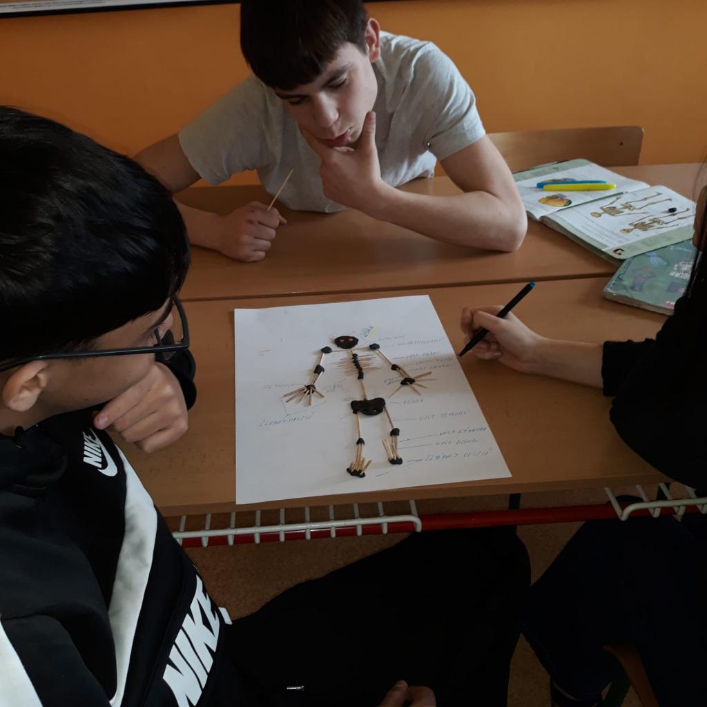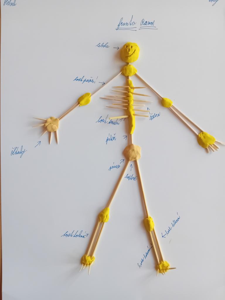 Žáci 8. třídy si vyzkoušeli sestavit zábavnou a kreativní formou pomocí špejlí a modelíny model kostry člověka.