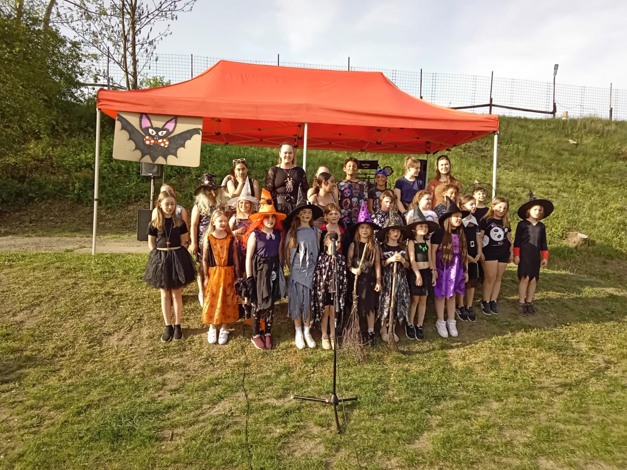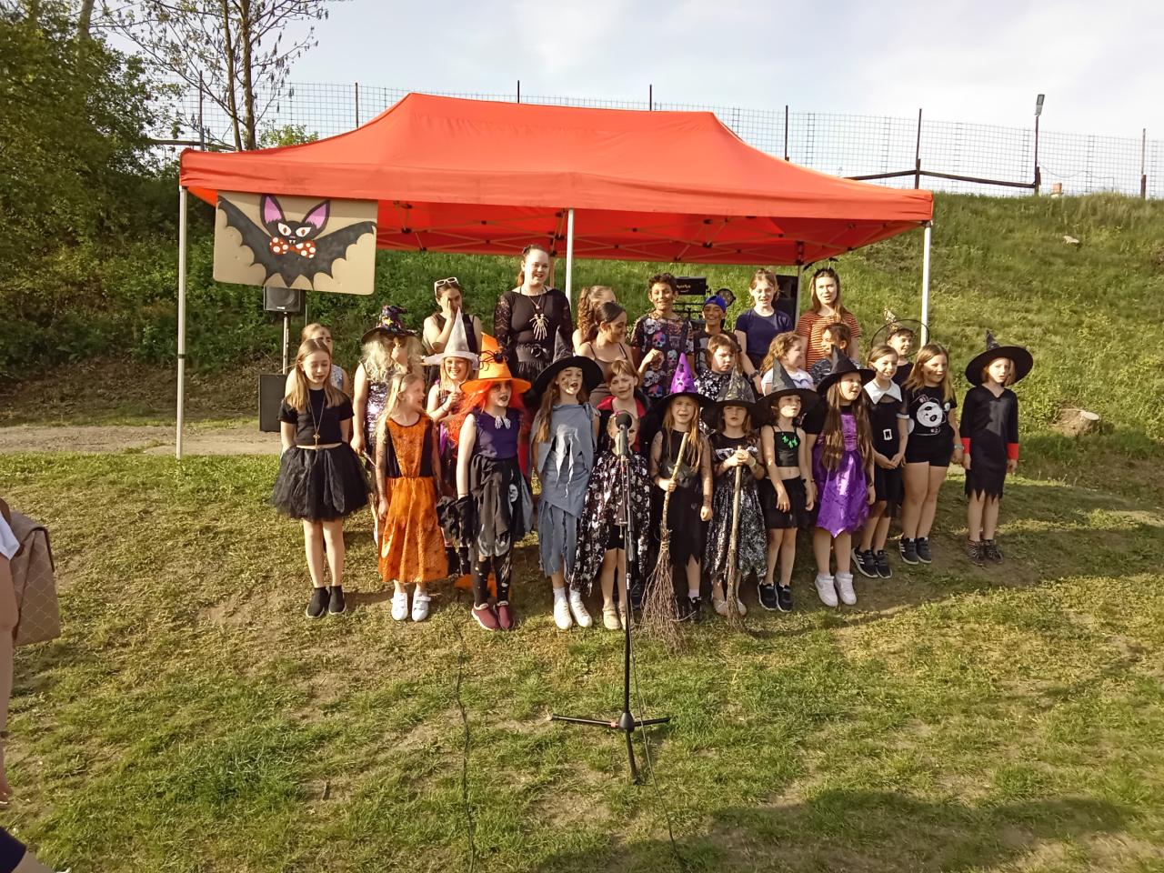 Pěvecké vystoupení žáků na akci - pálení čarodějnic v Hostomicích.