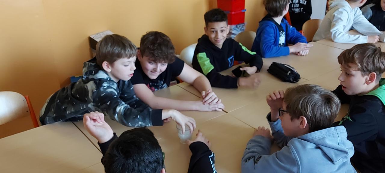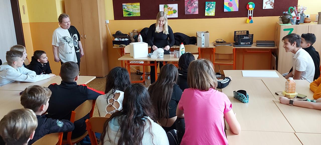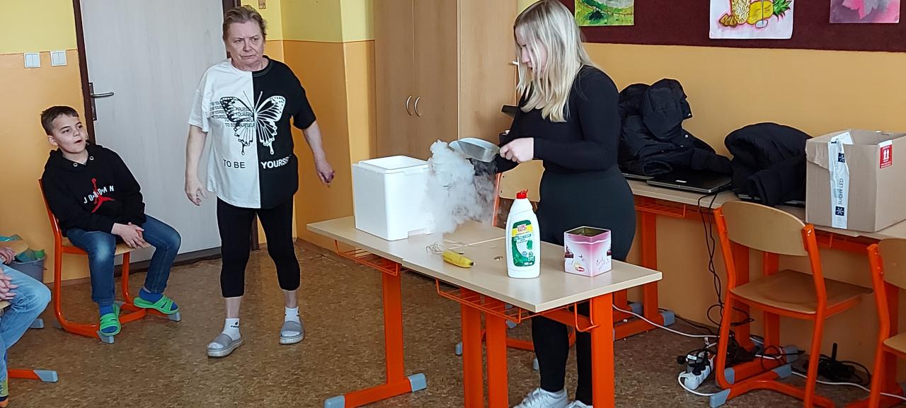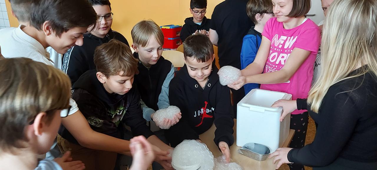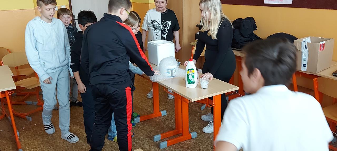 V rámci hodin přírodopisu a fyziky se žáci 6. třídy seznámili se suchým ledem.