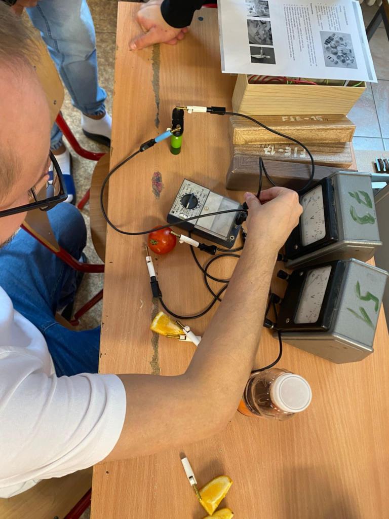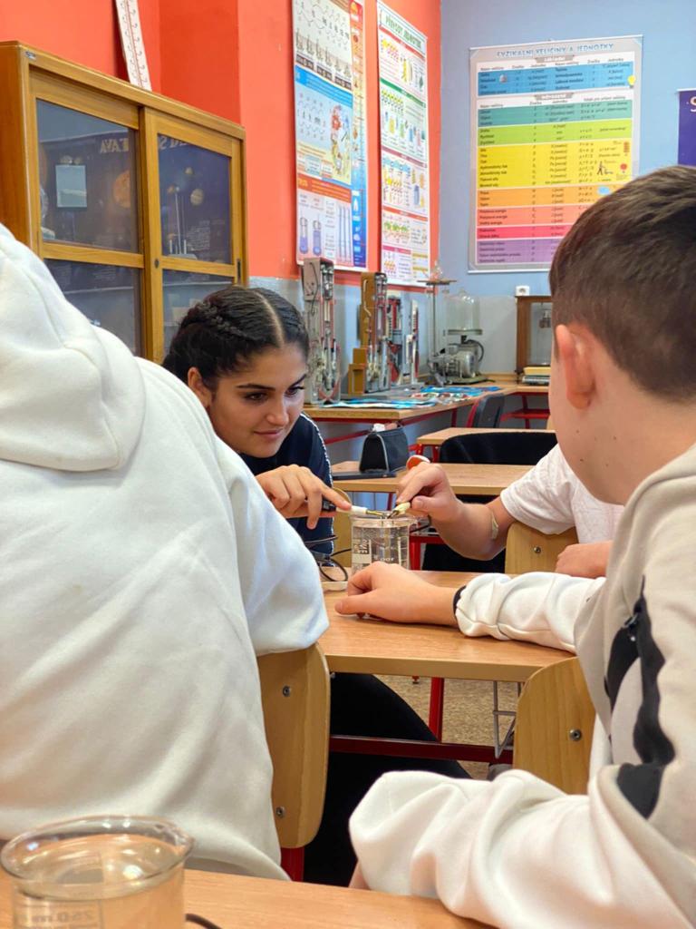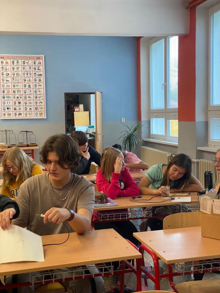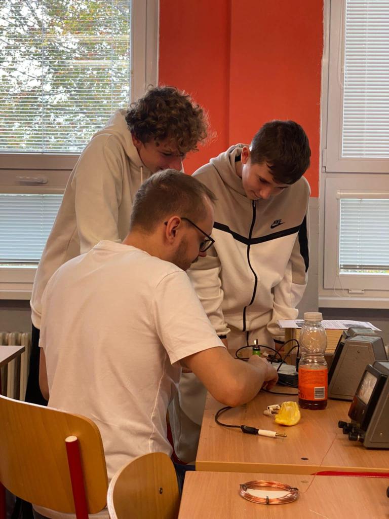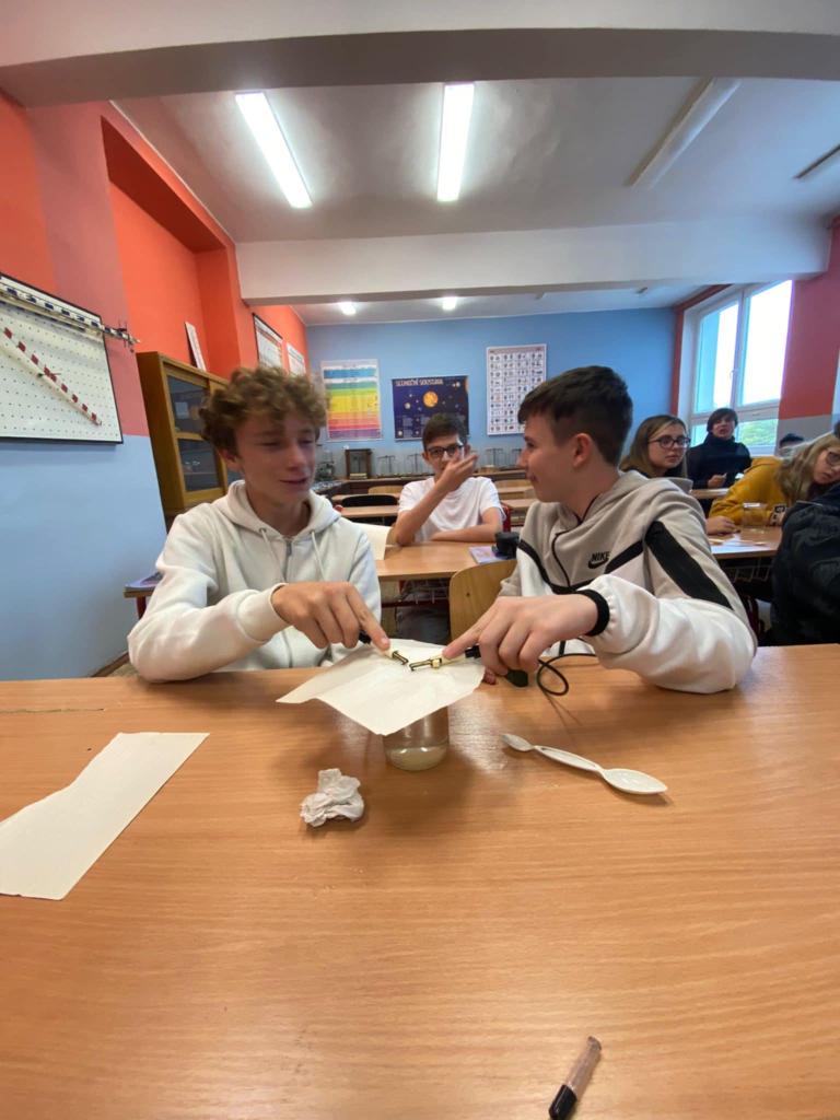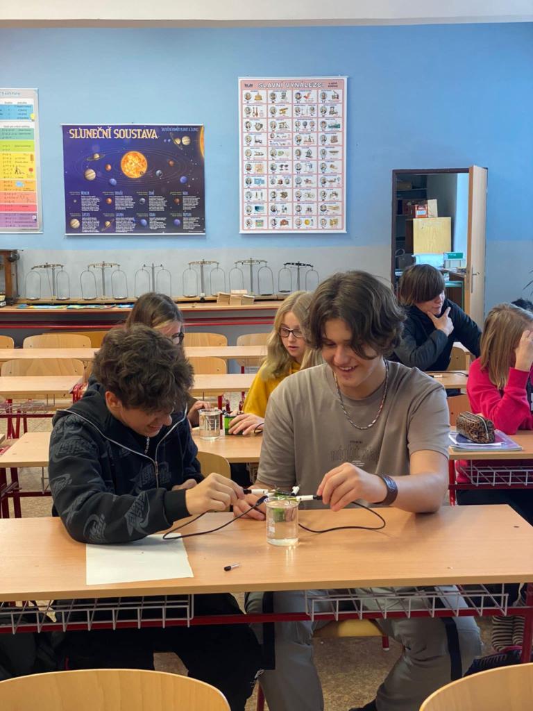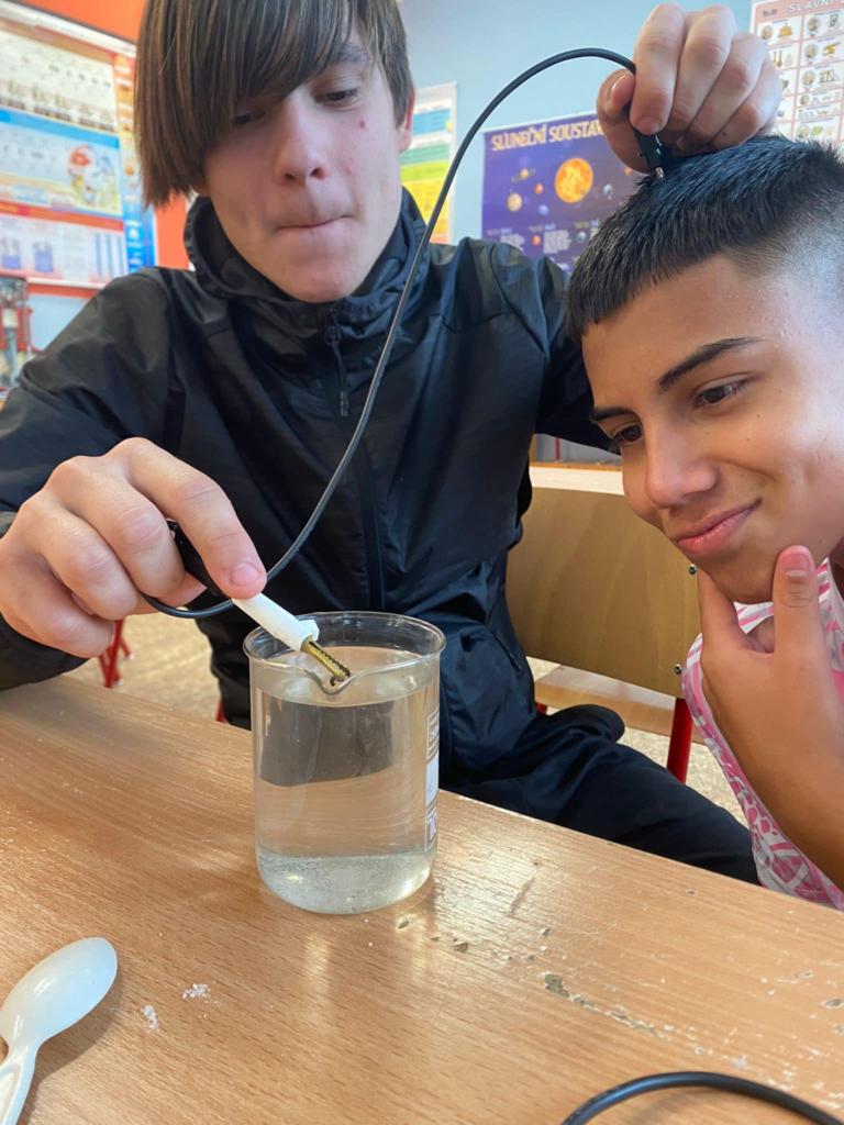 Žáci 9. třídy si mohli vyzkoušet v rámci hodin chemie elektrolýzu roztoku chloridu sodného. Při tomto procesu vznikal hydroxid sodný a dva plyny - vodík a chlór.