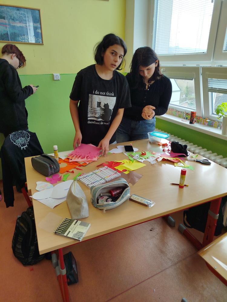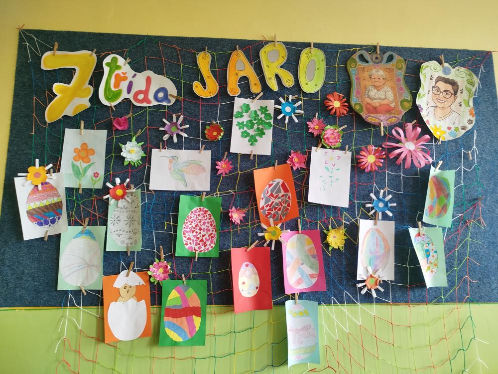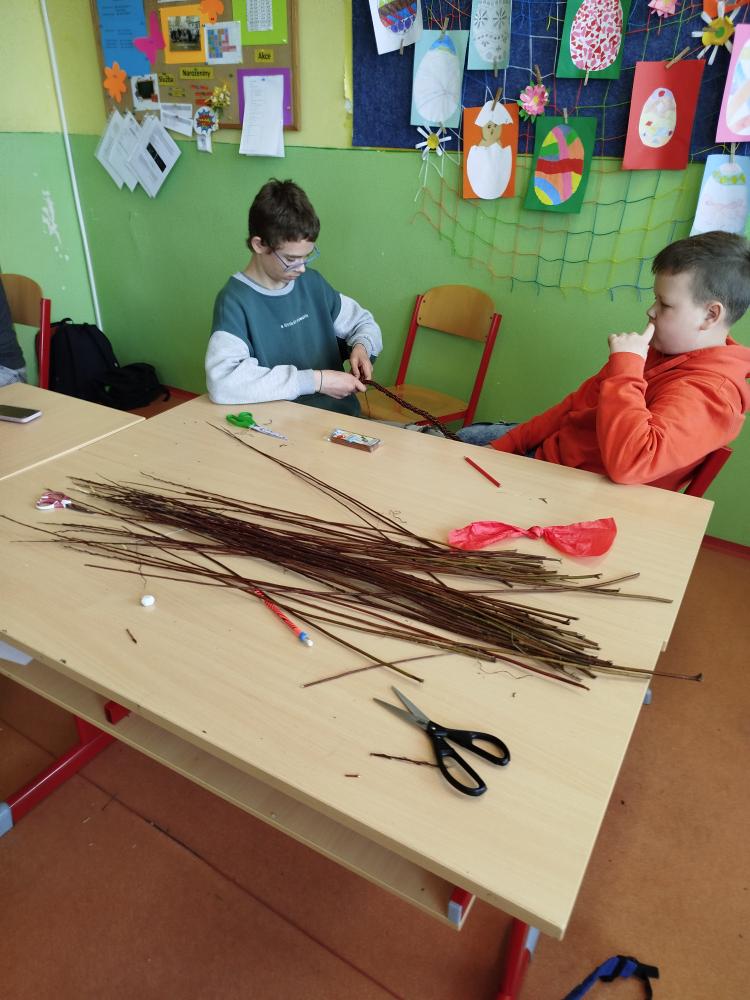 Ve skupinách žáci pletli pomlázky, různými způsoby zdobili vajíčky, tvořili zápichy, pracovali s přírodními materiály. Následně těmito výrobky upravovali připravené misky se vzrostlým osením. Zdařilá práce.